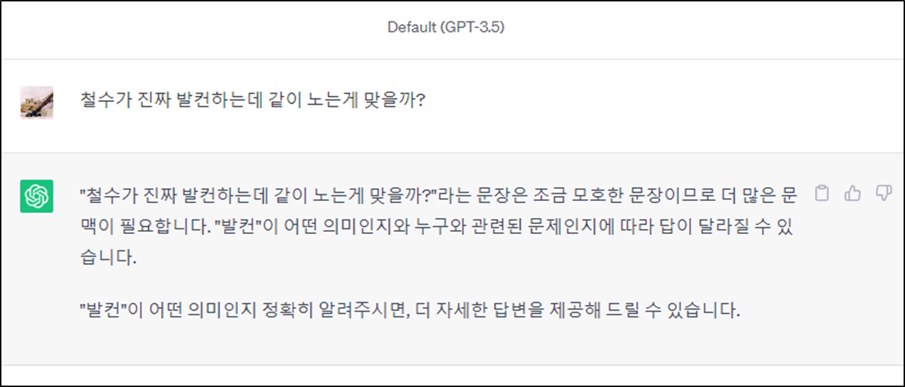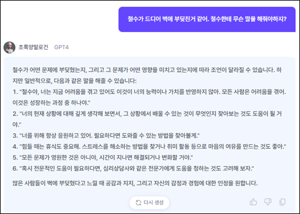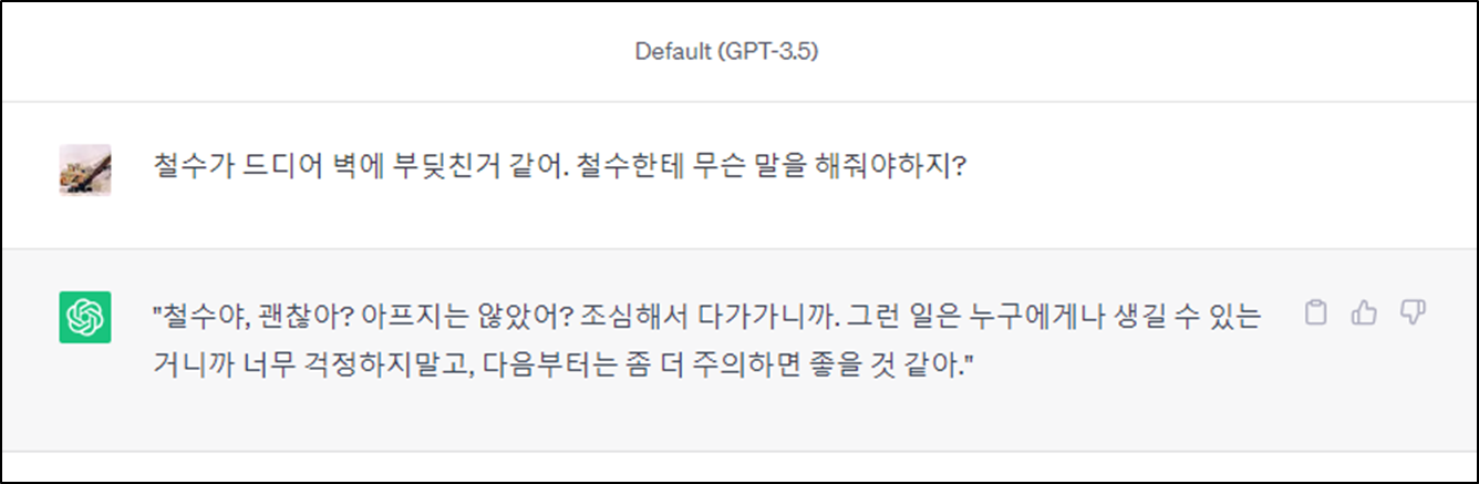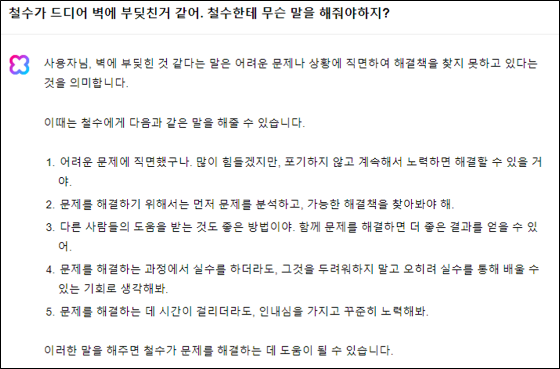 한국어를 곧잘하는 외국인과 회의를 하다가 "벽에 부딪쳤다"라고 했다가 "안 다쳤어요?"라고 하는 바람에 웃음을 참지 못하고 한참을 어렵게 설명했던 경험이 있다. 이를 GPT3.5와 클로바X에 한번 적용해보자.