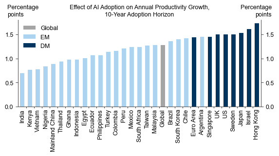 이로 인하여 향후 10년간 AI에 의한 전 세계 생산성이 1.4%p 증가할 것으로 예상되고 있으며, 이 또한 DM이 EM보다 높을 것으로 예상한다.