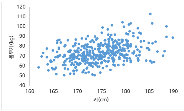 산점도는 개체별 몸무게와 키에 해당하는 곳에 점을 찍어 만들어지며 개체를 구성하는 두 쌍의 수치에 대한 분포를 보고자 할 때 유용하게 사용된다.