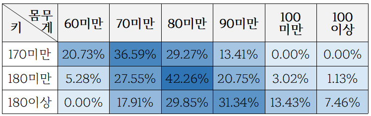 아래는 국방부에서 발표한 공군의 신체 데이터 표본을 활용하여 만든 히트맵으로 각 구간에 해당하는 인원수를 키를 기준으로 비율 계산 후 수치가 높을수록 녹색이 진해지도록 만들었다. 맵을 보면 키가 커질수록 몸무게가 높은 구간에 인원수 비중이 높아서 색이 진해지는 것이 한눈에 볼 수 있다.