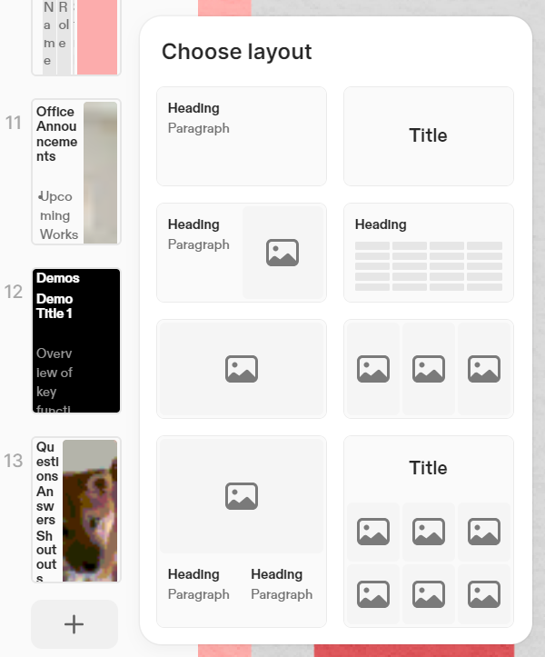 페이지를 추가할 때는 좌측 하단 1번 영역에서 레이아웃을 고른 후 추가하는 방식인데, 주의할 점은 파워포인트처럼 화면 아무 데나 글자를 배치하는 것이 아닌 바둑판처럼 격자로만 컨텐츠를 구성할 수 있다는 점이다.
