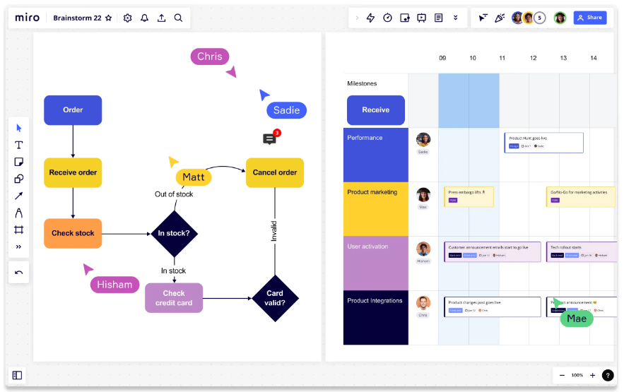 Miro(바로가기)는 온라인 화이트보드로 일정표나 작업 프로세스 등을 구성하는 데 특화된 협업툴이다.