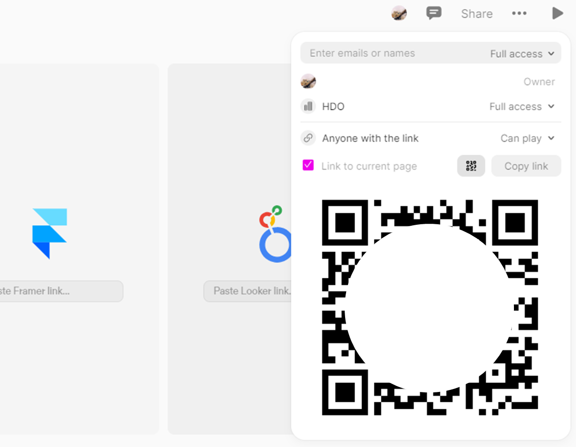 ※ 작업창 우측 상단의 Share를 클릭하면 QR코드 또는 링크를 통해서 해당 페이지를 그대로 공유할 수 있다.