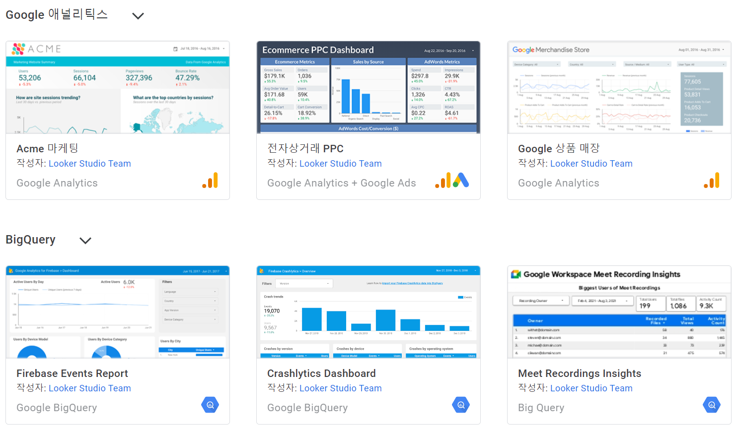 Looker(바로가기)는 대시보드 또는 데이터 보고서 작성툴이다. 템플릿을 눌러보면 구글 애널리틱스, 빅쿼리 등 구글에서 제공하는 각종 데이터 소스를 이용하여 보고서를 작성할 수 있다. 구글 애널리틱스만 해도 꽤 많은 데이터를 제공하고 있으니 천천히 뜯어보면 활용도가 있을 법하다.