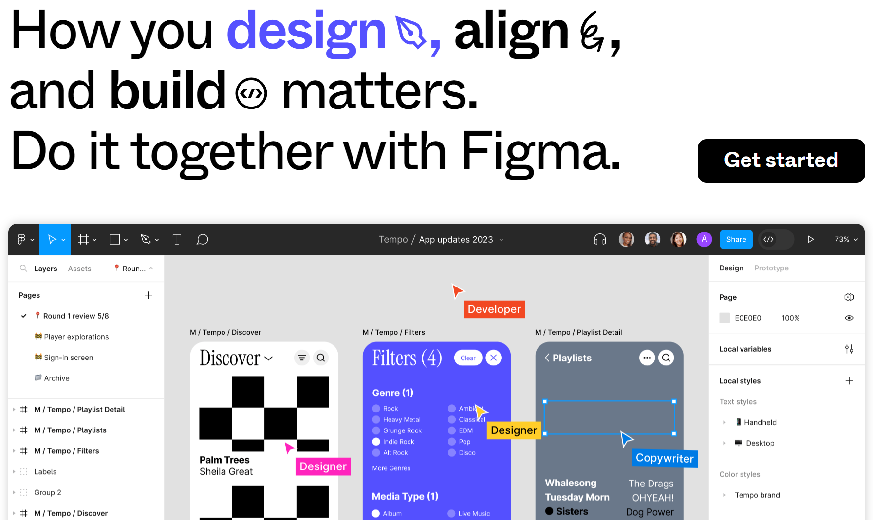 Figma(바로가기)도 처음 보는 툴이다. 하지만 홈페이지에 들어가 보면 Designer, Developer, Copywriter가 같이 작업할 수 있다는 걸로 보아 디자인 협업툴임을 알 수 있다. 수정이 많은 디자인 작업의 특성상 관련 인력들이 협업할 수 있다면 의사결정 시간이 단축될 수 있을 것이다.