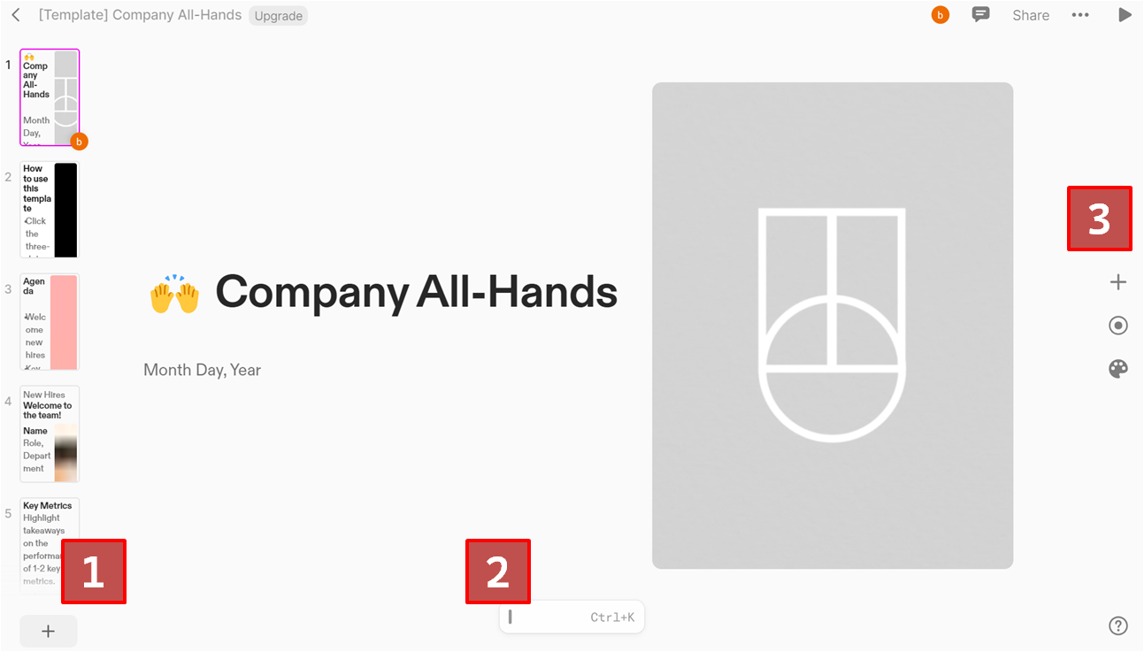 Create는 빈화면으로 시작되며 템플릿 선택 시 각 10페이지 정도의 화면을 예시로 보여준다. 가장 무난한 Company All-Hands를 눌러서 기능을 살펴보자.