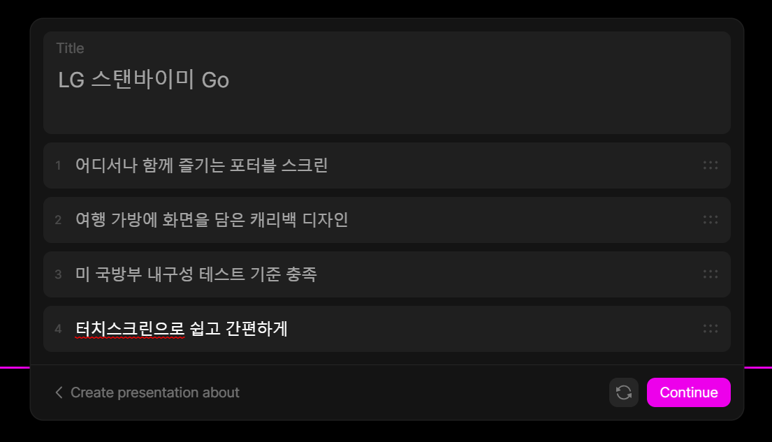 최근 핫한 LG 스탠바이미 Go 홈페이지에서 핵심문구를 4줄 가져와서 아래와 같이 입력한다.