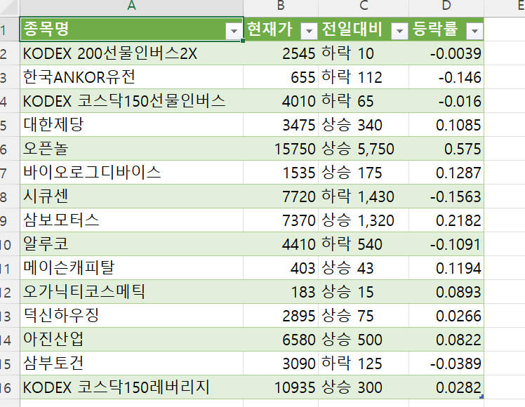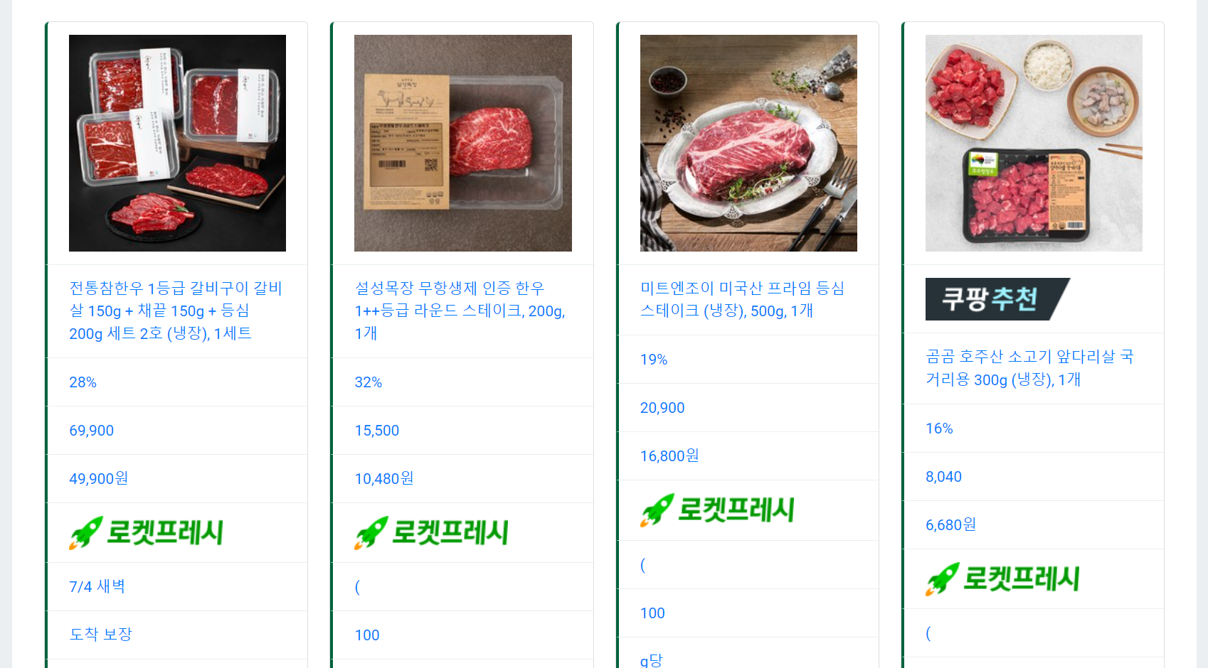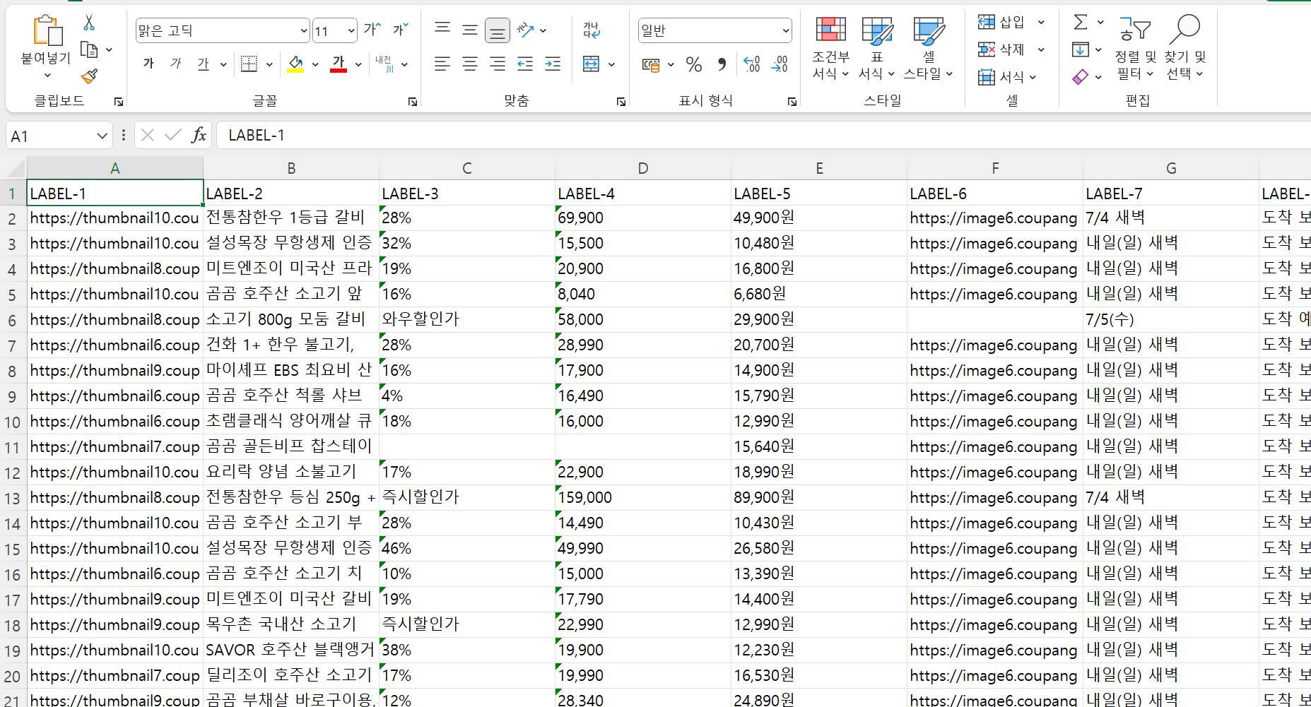 상품 이미지주소와 상품명, 할인률, 가격 등이 따로 다듬을 필요 없이 같은 컨텐츠끼리 깔끔하게 표로 들어가있다.