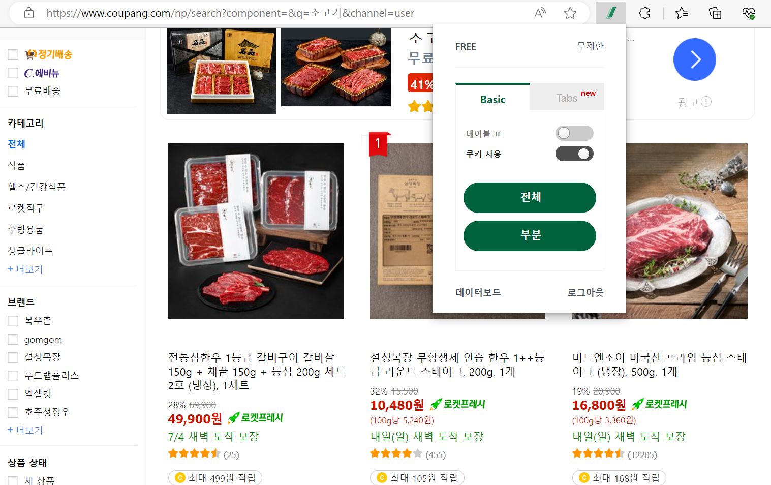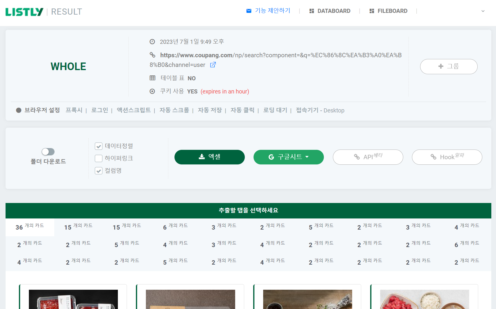 추출할 탭을 눌러보면 같은 형태의 컨텐츠끼리 묶어 있는데, 쿠팡에서 소고기 검색페이지를 긁었더니 상품목록에 있는 정보들이 가지런하게 나와있는 모습을 볼 수 있다.