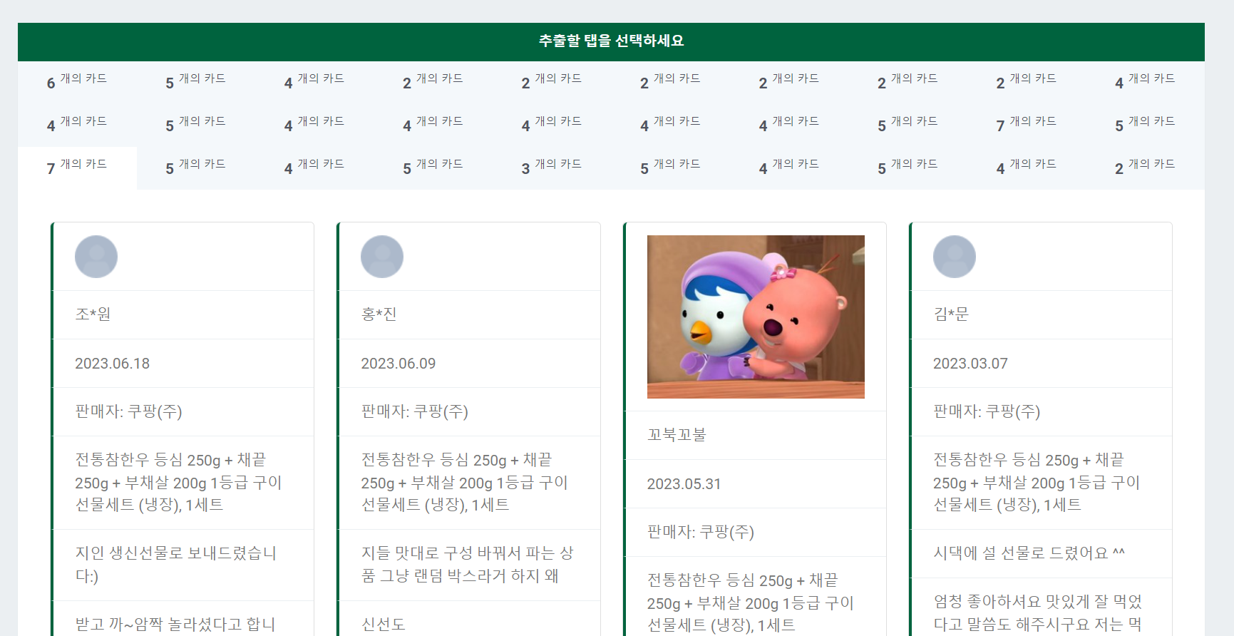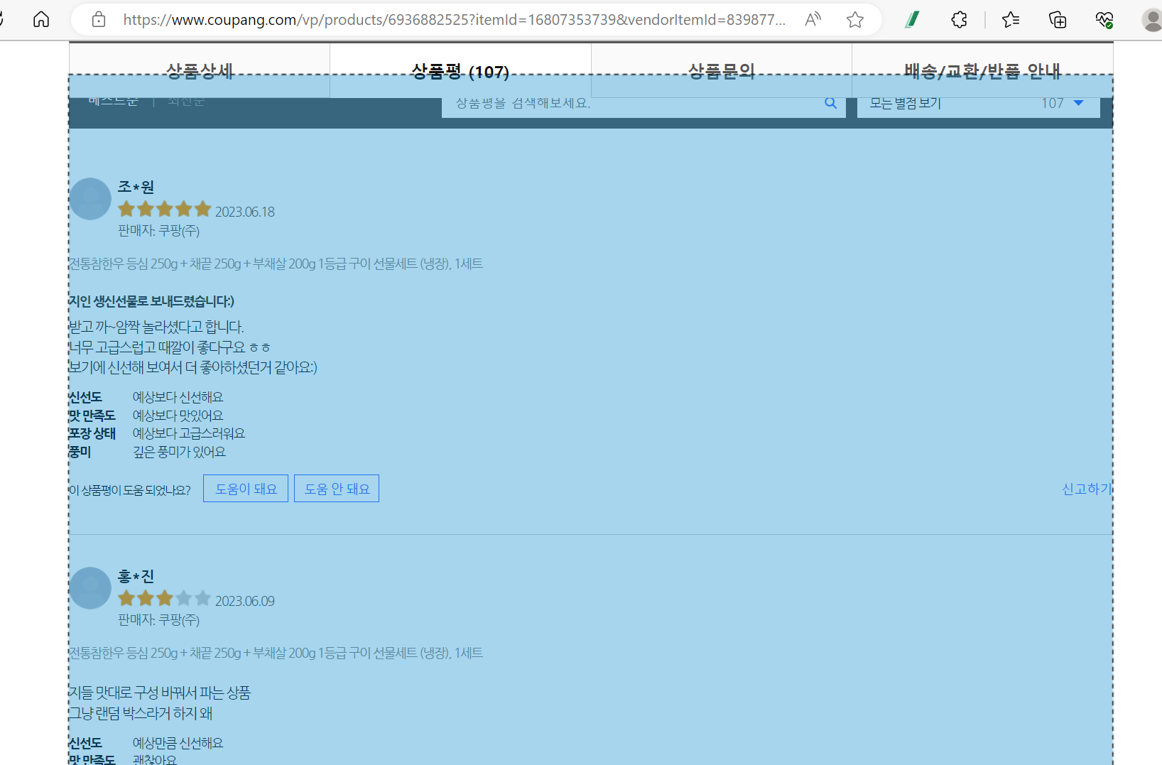 아래는 상품정보의 후기부분을 긁은 내용으로 좀 더 상세하게 컨텐츠가 나눠져 있어서 필요한 부분을 쉽게 선택할 수 있다.