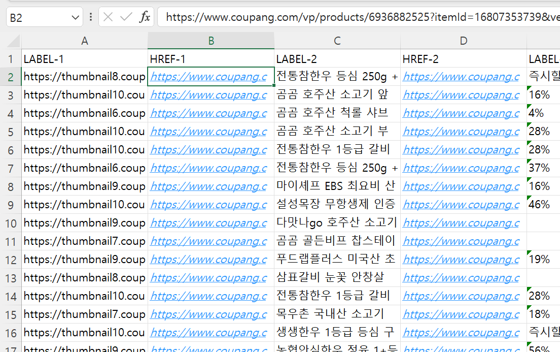 해당 페이지에 있던 각 상품정보로 들어가는 URL이 표에 추가된 것을 볼 수 있다.