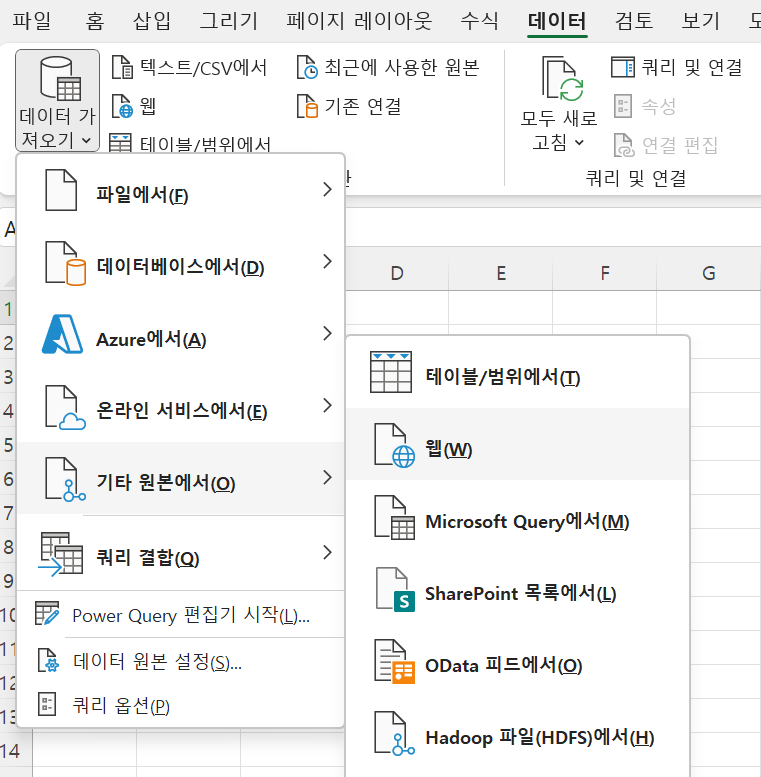 참고로 엑셀에도 데이터탭에 웹에서 바로 가져오는 기능이 있다. 아래와 같이 데이터 가져오기 > 기타 원본에서 > 웹을 선택한 후 가져올 URL을 입력하면 된다.