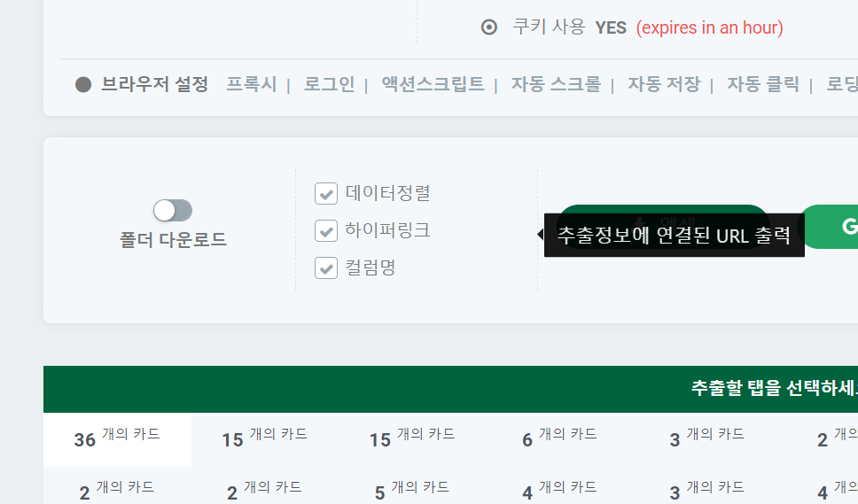 그러면, 아래와 같이 웹페이지를 자동으로 인식하여 Result페이지를 보여준다. 화면의 가장 윗부분은 긁어온 페이지, 그리고 중간에는 엑셀과 구글시트로 전달하는 버튼이 있으며 아래에 추출할 탭을 선택하는 화면이 나온다.