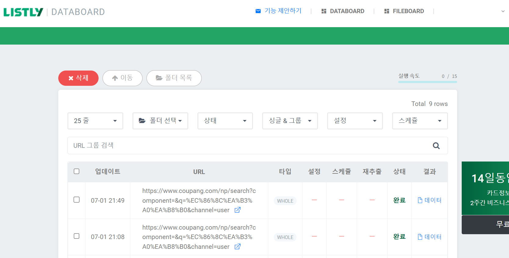 만약 회원가입과 로그인을 해둔 상태라면 결과화면에서 상단의 DATABOARD를 누르면 방금 긁은 페이지가 히스토리로 저장되어 언제든지 다시 확인할 수 있다.