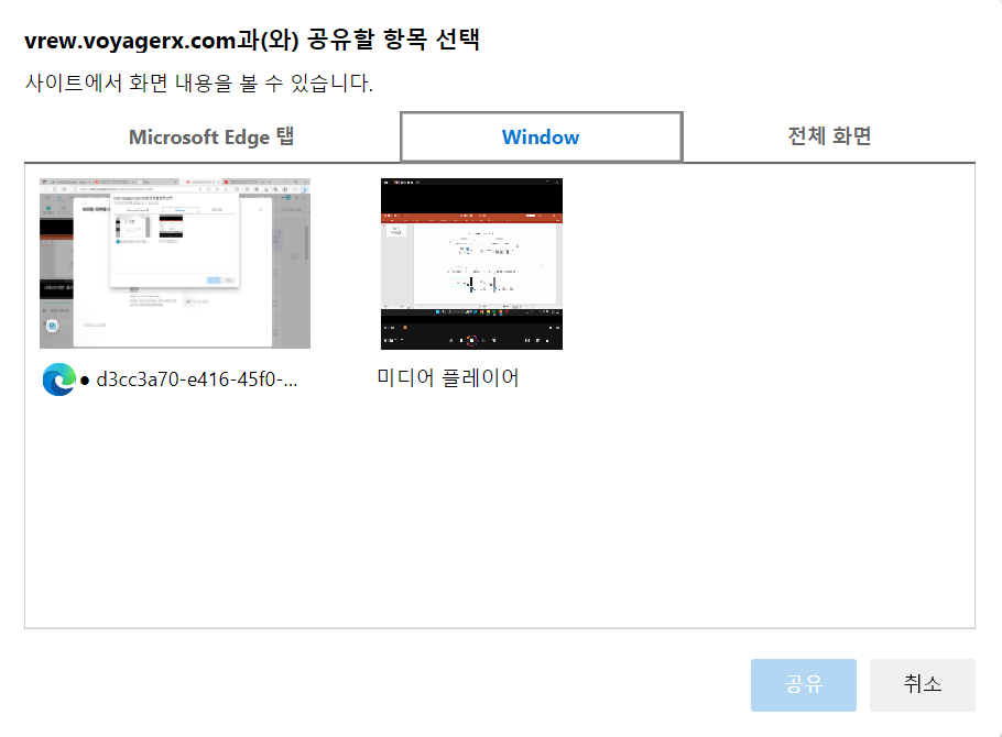 녹화할 화면을 선택하라는 버튼을 클릭하면 브라우저의 탭과 Window 프로그램을 선택할 수 있다.