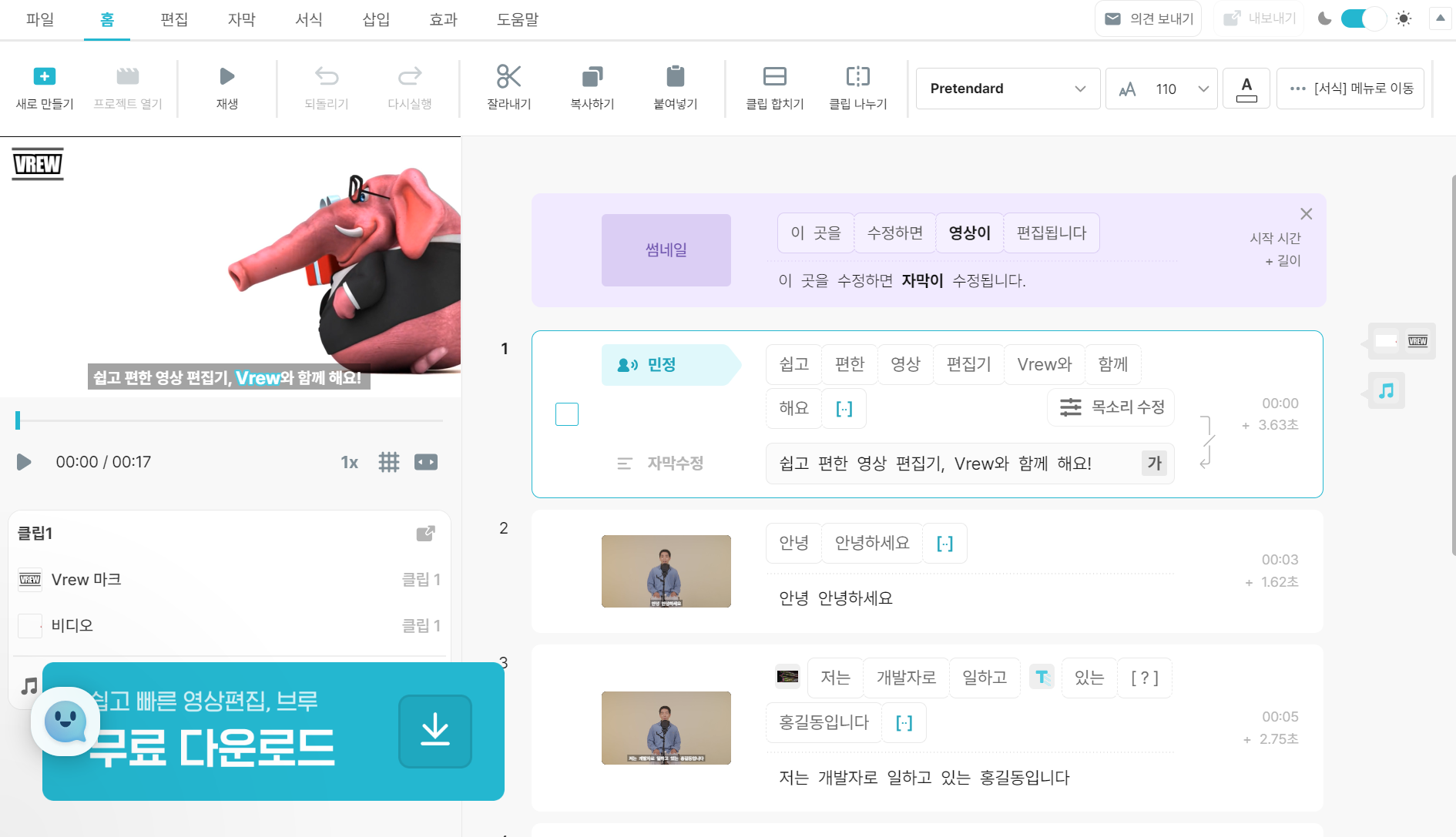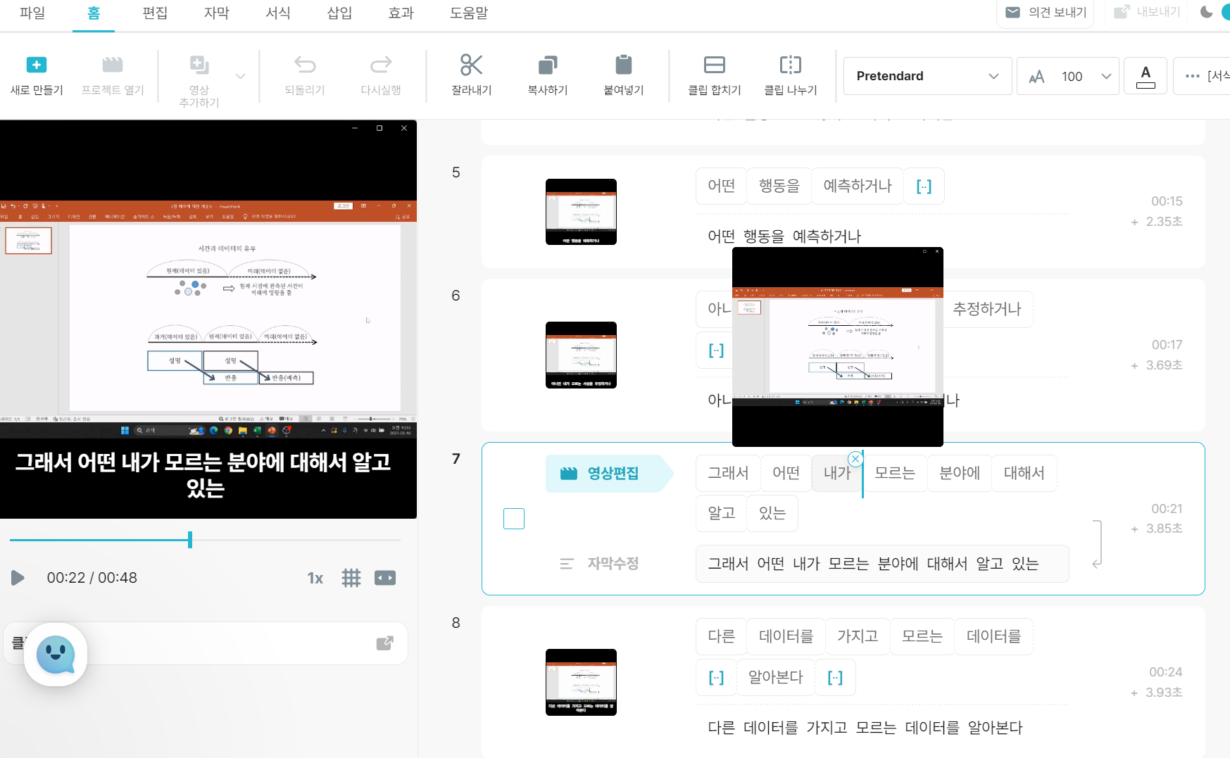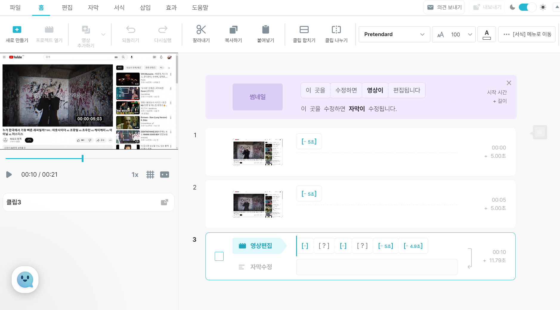 본 화면에는 영상과 스크립트가 입력된 화면이 보이고 메뉴에는 클립 합치기 등이 보이며, 간단한 편집 기능들을 제공한다.
