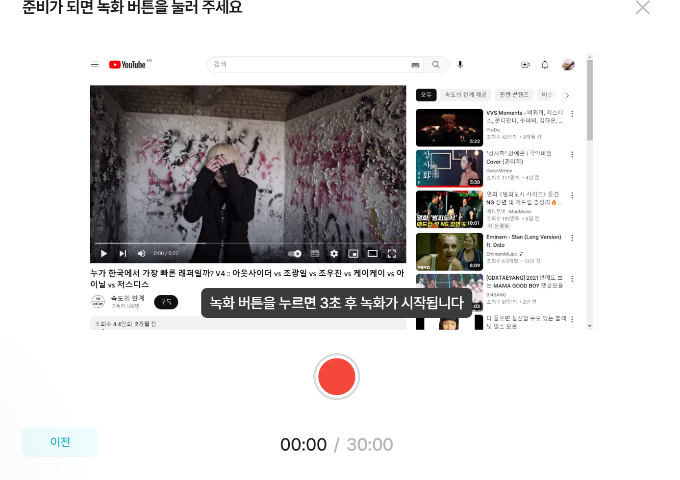 앞서 사용했던 녹화 및 녹음하기 버튼을 누른 후 브라우져에서 유튜브를 선택하면 된다.