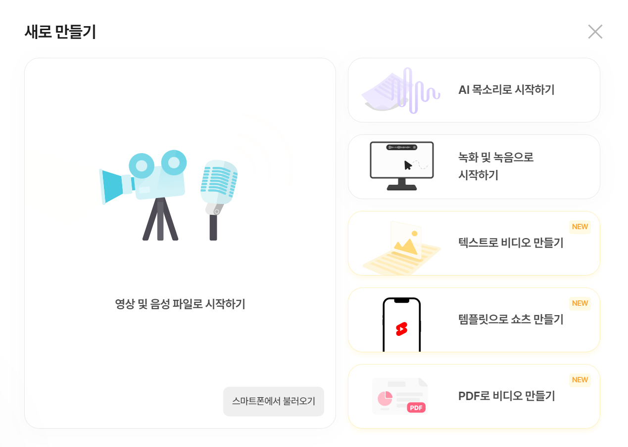 좌측 상단의 새로 만들기를 클릭하면 아래와 같이 여러가지 기능과 함께 영상을 가져올 수 있다. 크게 표시된 영상 및 음성 파일로 시작하기를 누르면 앱 설치를 권하는 화면이 나오니 우측에 있는 녹화 및 녹음하기를 눌러서 영상을 가져와 보자.