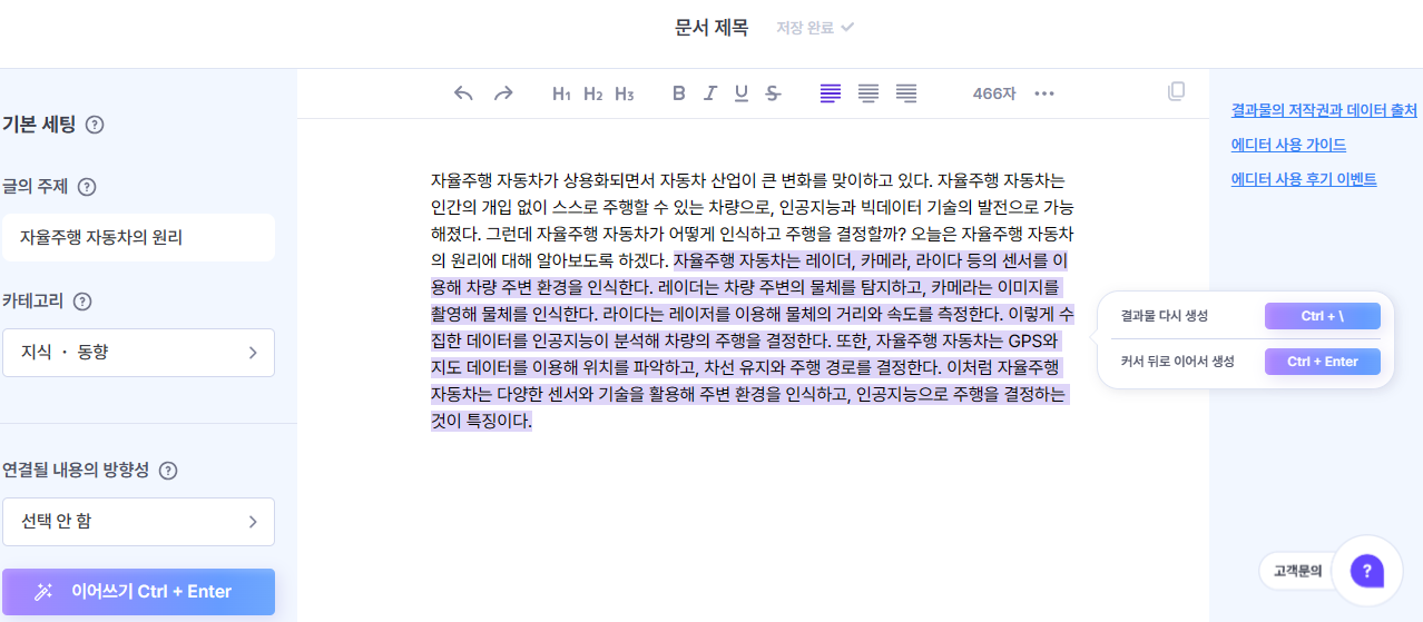 에디터는 챗GPT에서 질문에 따른 답변을 복사하여 활용하는 방식이 아닌 기능안에서 연결된 문서를 완성할 수 있다는 장점을 가지고 있다.