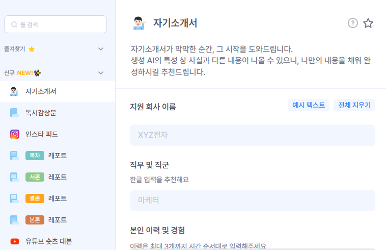 해당 기능들은 이전에 포스팅했던 AIPRM(바로가기) 처럼 프롬프트 작성을 지원해주는 기능이지만 훨씬 더 자세하고 국내 친화적인 내용들로 구성되어 있다.