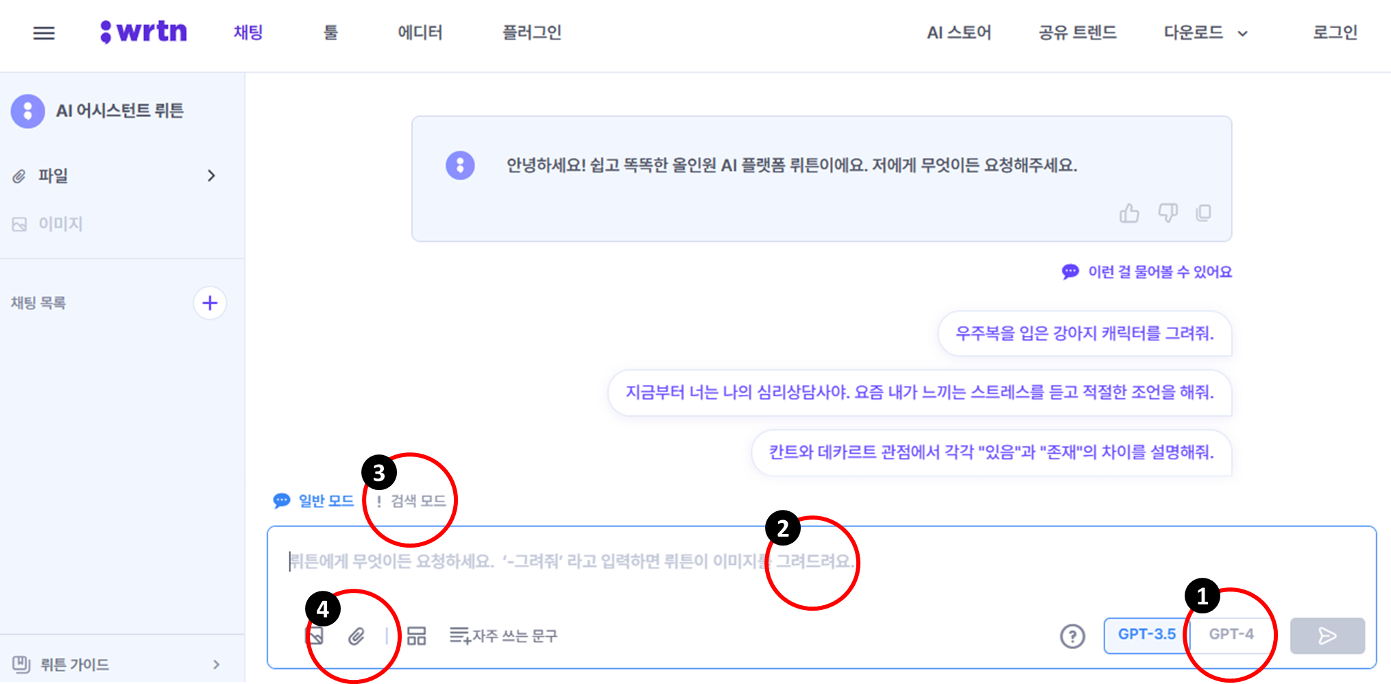 위의 화면은 뤼튼의 첫화면으로 채팅화면으로 시작된다.