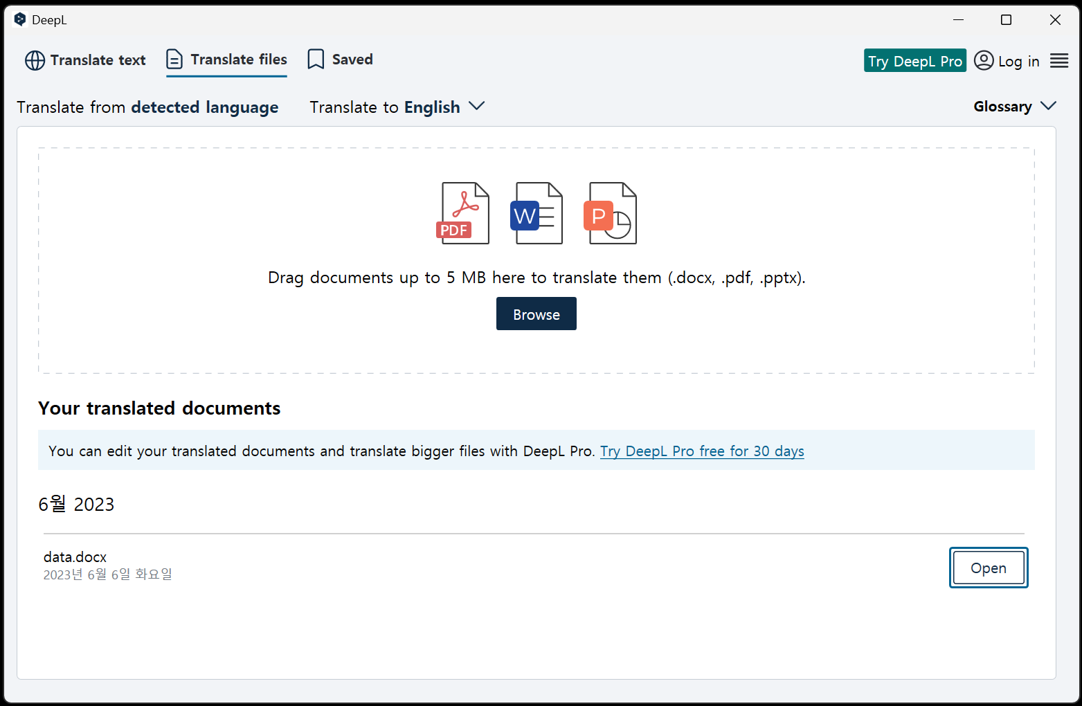 그리고 3위에 처음보는 DeepL이라는 서비스가 있어서 들어가봤더니 굉장히 유명한 서비스였으며, 웹사이트에서 제공하는 앱을 다운받으면 워드나 PDF파일을 빠르게 번역한 파일을 제공해준다.