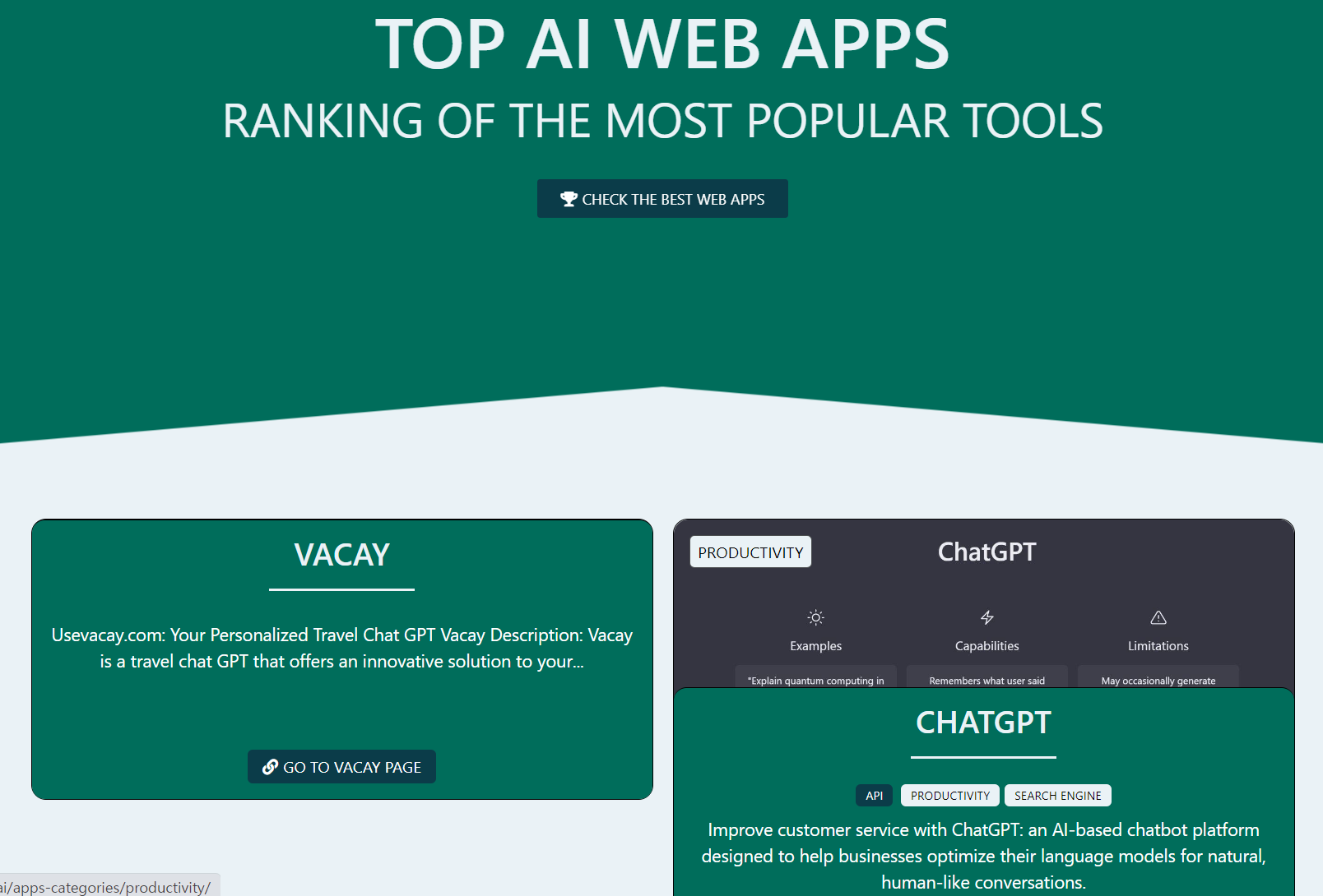 TOP APPS 메뉴에는 우리에게도 친숙한 ChatGPT와 미드저니, 달리와 같은 AI도 올라와 있으며 일부는 예약과 같은 현지 서비스라서 국내에선 쓸모 없지만, 대부분의 서비스가 AI기반 생산성 도구들로 등록되어있다.