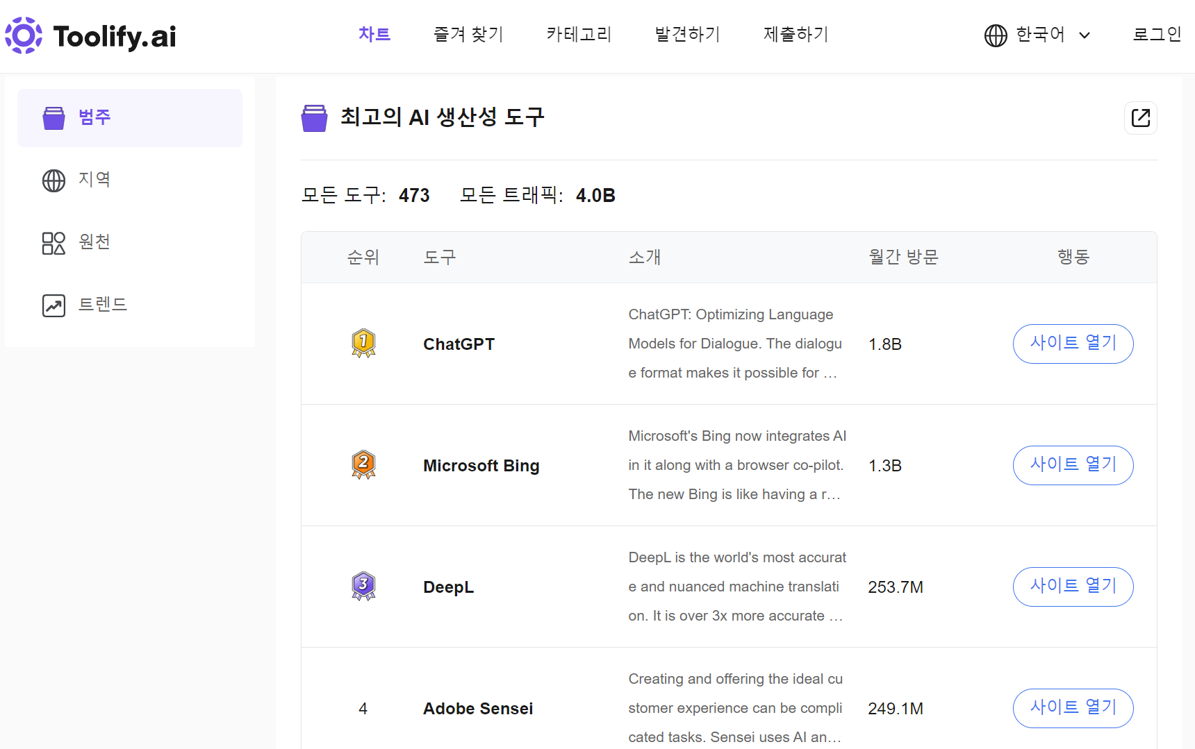 이 사이트가 특히 유용한 건 바로 분야별 AI웹사이트의 방문자 수를 알려준다는 것이다.