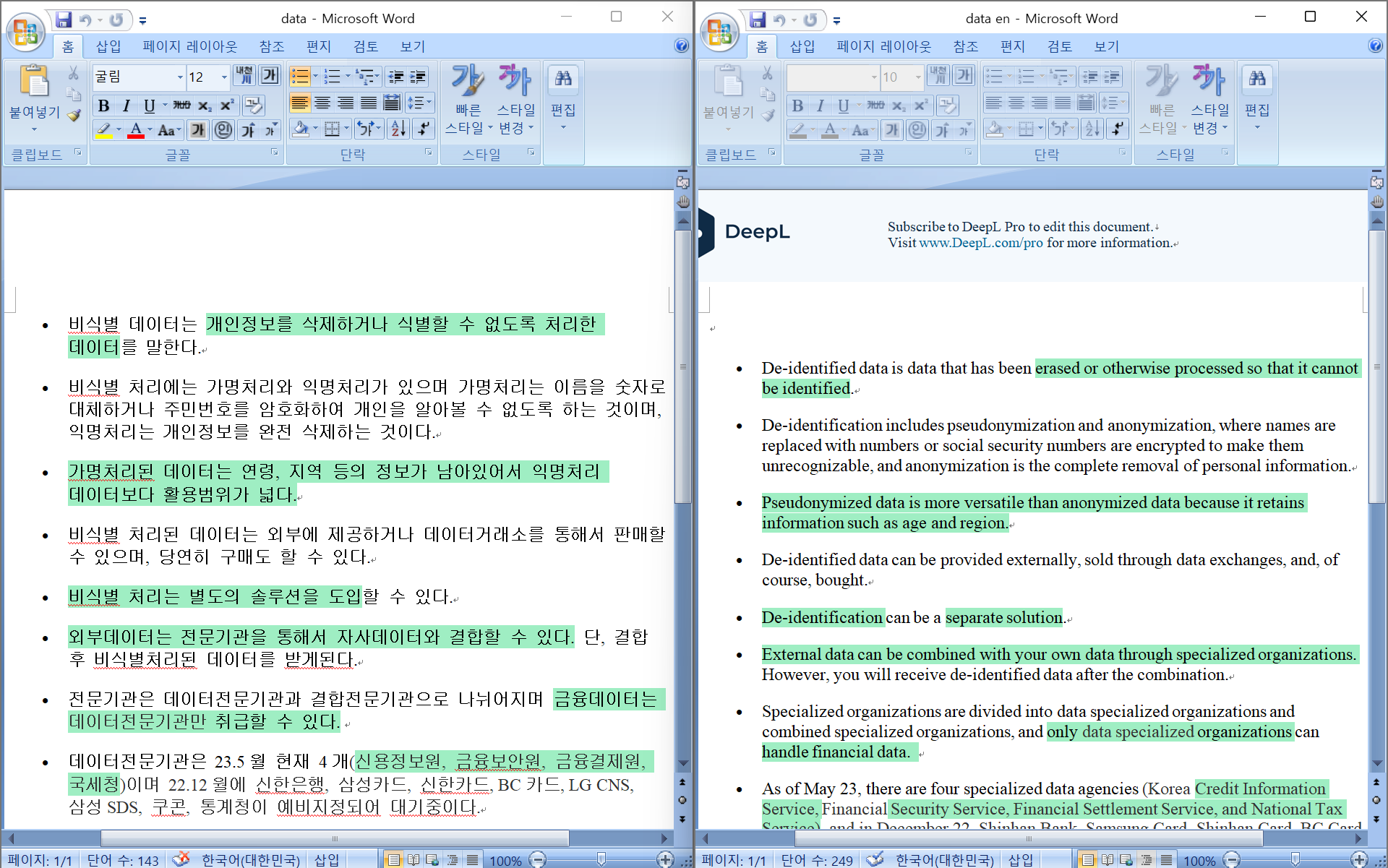 아래는 비정형 데이터에 대한 포스트를 워드로 옮긴 후 번역한 결과물로 파일을 드래그한 후 2~3초만에 번역된 파일을 다운받을 수 있었다. 이 정도 수준의 번역에는 회원가입도 필요없다.