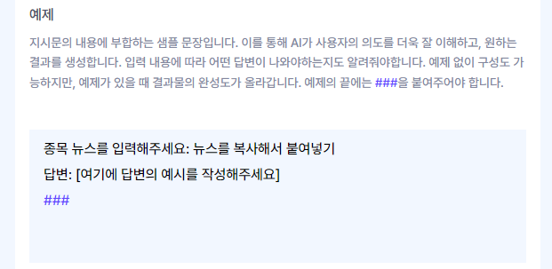 예제 창에는 대괄호로 답변 예시를 해달라는 부분이 있는데, 이 부분은 AI가 채우진 않고 사용자가 수작업으로 원하는 답변의 예시를 입력해줘야한다. 말 그대로 테스트이니 그냥 무시하고 넘어가본다.