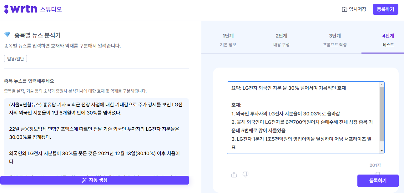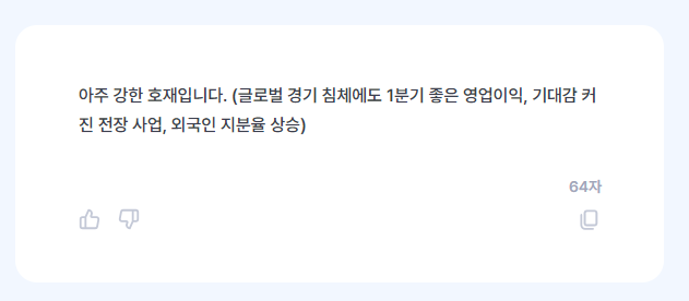결과를 보면 기사를 한줄로 요약한 후 아래에는 호재라고 표시한 후 항목을 나눠서 근거를 표시해준다.