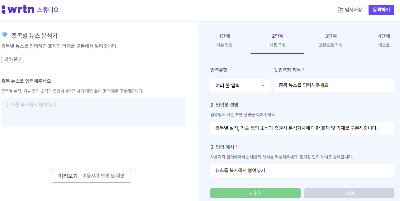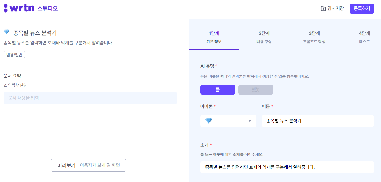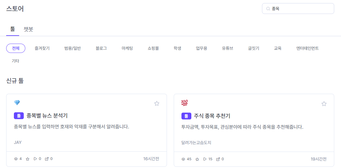 실제 투자에 활용할 수 있을지는 좀 더 지켜봐야하겠지만, 뉴스를 구분하고 요약해주는 기능은 탁월해 보인다. 테스트를 마친 후 마지막 등록창을 누르면 아래와 같이 뤼튼의 AI스튜디오 메뉴에 등록된 프로그램을 볼 수 있다.