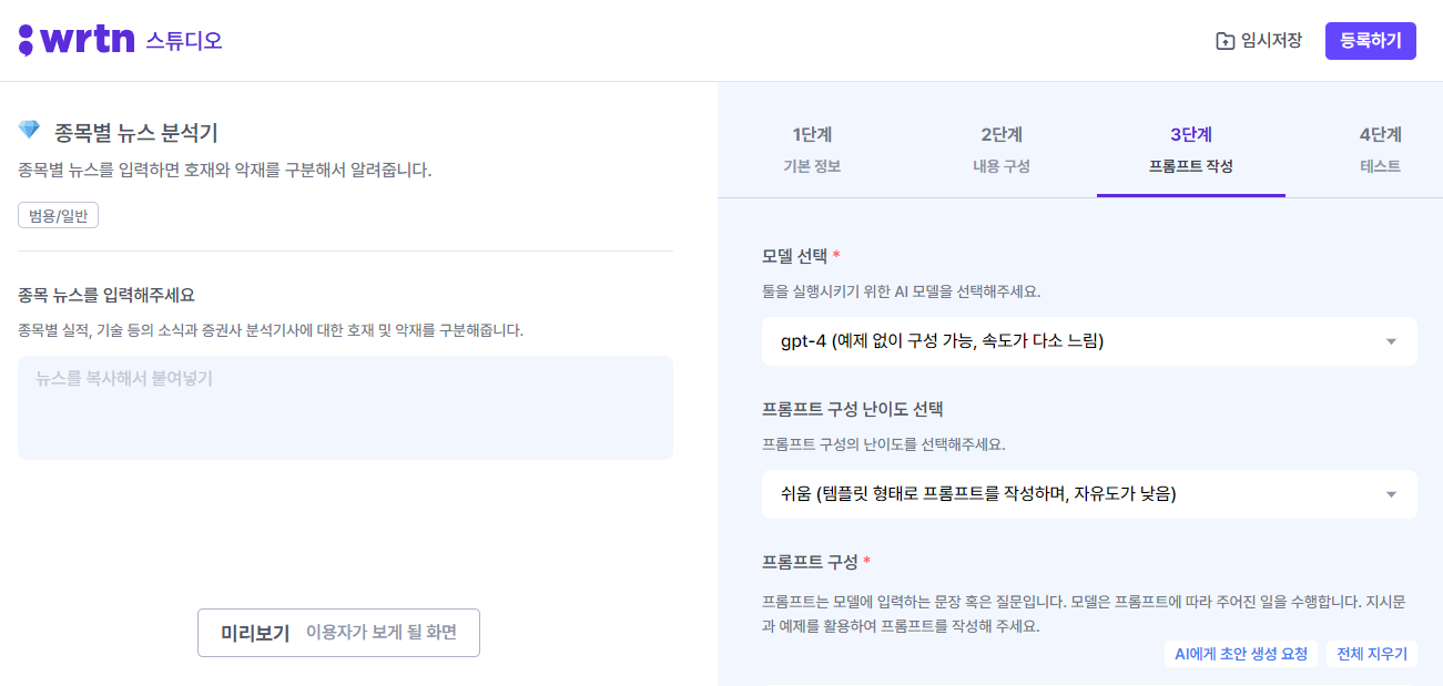 역시 기대를 져버러지 않고 모델 선택 시 GPT-4를 선택할 수 있도록 만들어뒀다. 속도가 느리다는 부연설명이 붙어있지만 더 좋은 성능을 기대해보면서 GPT-4를 선택하고 프롬프트 구성 난이도는 쉬움을 선택하였다.