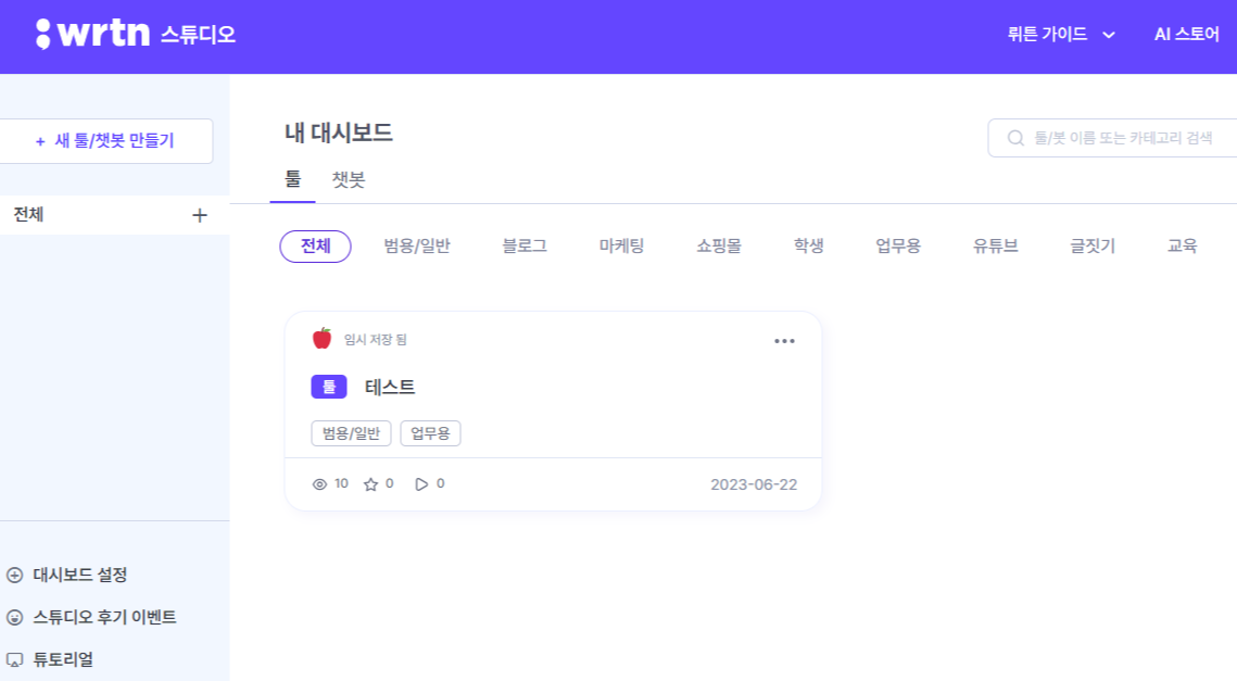 뤼튼 스튜디오를 시작하면 다음과 같은 대시보드가 먼저 보인다. 등록되어있는 테스트는 임의로 만들어본 것으로 처음 들어가면 텅빈 화면이 나온다.