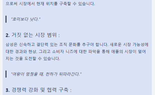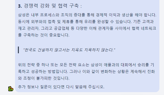 번역체라 좀 이상하지만 단락을 나누어 상세한 전략까지 수립해주는 꽤 유식한 챗봇도 있다.