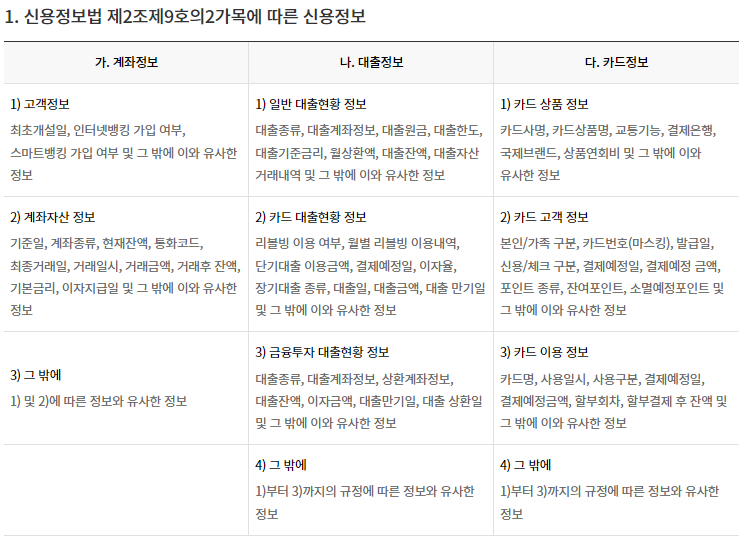 단순히 마이데이터에서 어떤 데이터를 받을 수 있는지 궁금하다면 정보제공API(바로가기)를 확인하면 시행령에 따라 제공가능한 데이터가 기재되어있다.