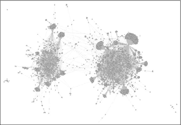 그러나 실제로 관계지향 소셜 네트워크를 시각화해보면 서로 탄탄한 관계를 맺고 있는 덩어리가 형성되고 각 덩어리들이 몇개의 가지들에 의해 연결되는 형태를 가지게 된다.