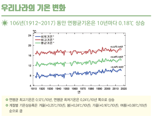 시계열 데이터는 차트로 구성해보면 일정한 패턴과 추세를 볼 수 있는 경우가 많은 데, 당장 기온만 하더라도 자전으로 인해 밤낮으로 등락을 반복하고 공전에 따라 계절별로 바뀌는 패턴을 가지고 있어 누구나 쉽게 인지할 수 있으며, 최근 100년간 꾸준히 상승하면서 인류 모두가 추세를 실감하고 있다.