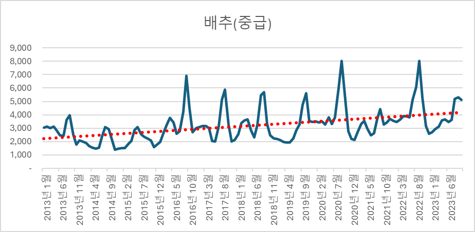 엑셀에서 추세선만 그어봐도 2013년 2천원대에서 2023년 4천원으로 2배 가량 오른 것을 알 수 있다. 그리고 매년 8~9월에는 평상 시보다 2~3배 이상 가격이 올라 8천원까지 상승한 것을 볼 수 있다.